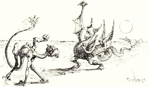 "Now it happened that in the same exhibition with the Dude Giant there was a Dwarf named Tiny W. Littlejohn—W standing for Wee, which was his middle name. He was a very good-natured fellow, Tiny was, and as far as he knew he hadn't an enemy in the world. He was so very nice that everybody who came to the exhibition brought him cream cakes, and picture books, and roller skates, and other beautiful things, and nobody ever thought of going away without buying his photograph, paying him twenty-five cents extra for the ones with his autograph on, which his mother wrote for him. In this way the Dwarf soon grew to be a millionaire, while the Dude Giant squandered all he had on riotous hats, and so remained as poor as when he started. For a long time everything[Pg 27] went smoothly at the Exhibition. There were no jealousies or quarrels of any sort, except between the Glass Eater and the man who made Glass Steamboats, and that was smoothed over in a very short time by the Glass Eater saying that the Glass-blower made the finest crystal pies he had ever tasted. But contentment and peace could not last forever in an establishment where one attraction was growing richer and richer every day as the Dwarf was, while another, the Dude Giant, was no better off than the day he joined the show, and when finally the Dwarf began to come every morning in a cab of his own, drawn by a magnificent gray horse with a banged tail, and to dress better even than the proprietor of the Museum himself, the Dude Giant became very envious, and when the Dude Giant gets envious he is a very disagreeable person. For instance, when no one was looking he would make horrible faces at Tiny, contorting his four mouths and noses and eight cheeks all at once in a very terrifying manner, and when he'd look cross-eyed at the Dwarf with all eight of his eyes poor Tiny would get so nervous that he would try to eat the roller skates and picture books, instead of the cream cakes people brought him, and on one occasion[Pg 28] he broke two of his prettiest teeth doing it, which marred his personal appearance very much.