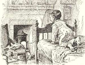 Then, as his nurse extinguished the lamp and went into the adjoining room to sew, Jimmieboy[Pg 12] threw himself back upon his pillow and shed a tear. The tear crept slowly down over his cheek, and was about to disappear between his lips and go back again to where it had started from, when a voice was heard over by the fire-place.