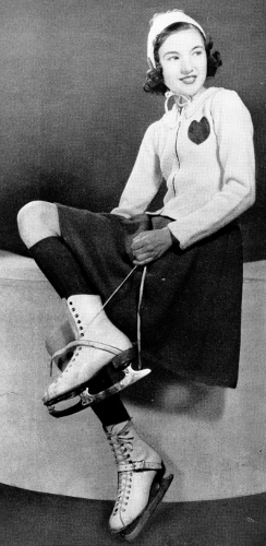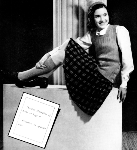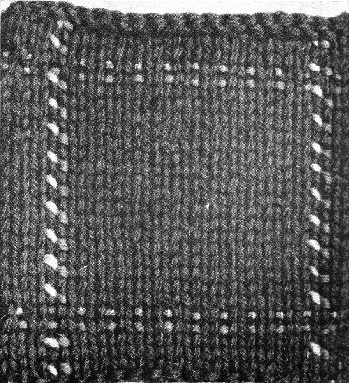 With No. 3 needles, cast on 84 sts (88 sts, size 5), K 1, P 1 ribbing for 6 rows. Next row, K 1, *Y O, K 2 tog, repeat from *across row. Continue ribbing for 6 more rows. Now shape back as follows: K 4, turn, (slip the first st when purling back), P back, K 8, turn, P back, K 12, turn, P back. Continue in this manner, working 4 more sts every K row until there are 44 sts, then P back and on 84 sts, K 1 row, turn, P 40, K 4, P 40, repeat these 2 rows for 2½ inches (3 inches, size 4). Now inc 1 st at each end every 6th row, 5 times, then every 4th row 2 times, continuing to K center 4 sts to hem. (98 sts). Dec 1 st at each end every other row 7 times. Work even for 1 inch. P 1 row on K side. P 1 row, K 1 row for 6 rows, bind off loosely. Make other leg to correspond, starting shaping of back on opposite side as follows: P 4, turn, K back. P 8, turn, K back and continue in this manner until[Pg 31] there are 44 sts, then K back and continue same as other leg. Sew up seams and turn back hem. Press creases back and front.