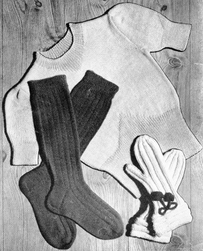 The season of 1946-47 promises to be the biggest of all seasons in knitting—you'll be knitting for the boys at camp—and in your spare time for the young Americans who are at the Fireside with you. So—Mothers, get out your knitting needles or crocheting hooks and relax in a nice big chair, turn on your radio to some soothing music, unwind your yarn—and in the pages of this book will be enough inspiration to make Mr. and Miss Young America the world's best dressed Children. There are Infants and Juvenile Styles cleverly and colorfully designed—and the Smart Young Miss has her day too, for there are some Garments that will be sure to meet with her approval and needs.