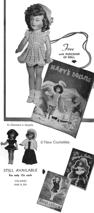 IMPORTANT—the six costumes and their instructions are EASY-TO-FOLLOW. You will truly ENJOY knitting these little outfits yourself, from odds-and-ends of yarn in your basket. No expense—and very, very little time involved. Just "happy moments of knitting." Remember, Volume 9 is FREE WITH THE DOLL; you can also purchase the two previous volumes of "Mary's Dollies" at the same time for 15c each.