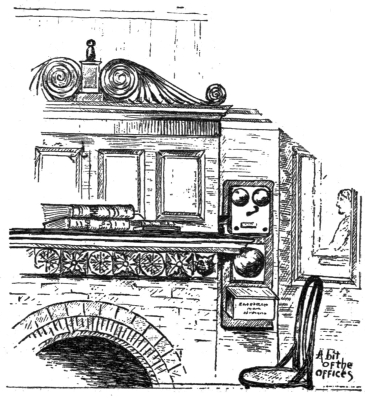 Electric bells and tubes afford telephonic communication141 with every department. Steam heat radiates throughout the entire building, and a reel of hose attached to a water supply pipe is in readiness upon each floor in case of fire. The length of steam, gas, and water pipes throughout the building is estimated at five miles. The telegraph call-box signals for the messenger, and the telephone, aids in the execution of the advanced method of reducing the detailed requirements of a large business to a perfectly controllable system in its management.