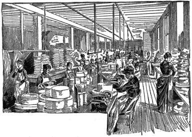 Ascending to the fourth floor, the noisy sound of machinery is first heard. This is the department for sewing straw braid; here unquestionably centres the interest in a hat factory; the hum of a hundred machines quickens the pulse, and to the observer, the interest and astonishment increases as the wonderful machine with its lightning speed, guided by the magic touch of the young woman who rules it, draws towards itself yard after yard of the delicate strand of straw plait which it sews together by the finest stitch of the most slender thread, till suddenly a hat comes forth, complete in its full perfection of shape. One's surprise would not be more greatly heightened by a display of the magician's art. The marvel of this accomplishment may be effectively demonstrated by a simple statement. That bit of mechanism occupying a space of 10 x 12 inches, with its135 apparently simple arrangement of levers and cogs, merely carrying a needle to and fro, up and down, will do in a single minute the work an industrious woman with her unaided fingers could not do in less than an hour. That little machine is capable of doing within the working hours of a day the labor of sixty women; while a hundred machines in a factory are capable of producing the handwork of six thousand people; this shows the progress of136 the world, and the advance that has come to this branch of industry within the last thirty years.
