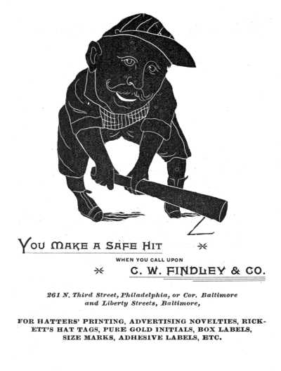 What may have been the actual condition of the hat business of Baltimore just before the Revolution has been difficult to ascertain. Mr. Shields must have been in business during this period, and it is more than probable that in a town of the size of Baltimore at that date there must have been others engaged in this branch of business, but how many and who they were cannot be ascertained. It is very likely that the restriction placed by English rule upon most manufacturing industries prior to the Revolution operated detrimentally upon this industry also, and while the ordinary kind of wool felt hats were made by the hatter in his own shop, undoubtedly most of19 the fashionable hats sold and worn at that time were of English or French make. Paris (which then, as well as now, was the axis upon which revolved the world of fashion) possibly supplied the wants of Baltimore's highborn gentry, always famous for exquisite dress and refined taste, with the French chapeau—the ton of those days.
