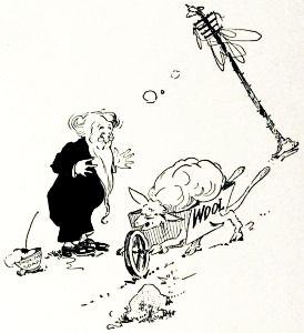 "Then maybe I have seen them," said the Unwiseman, with a smile of satisfaction. "Maybe I have. Several things went by here day after to-morrow that weren't a bit like wheelbarrows or telegraph poles. They[Pg 22] may have been your sheep. One of the things had four red wheels on it—have any of your sheep got four red wheels on them?"