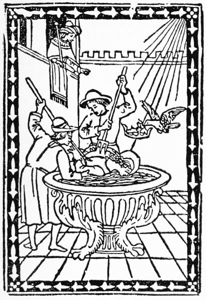 The cuts of the Canterbury Tales depict for the most part the various individuals of the Pilgrimage, and there is also a bird's-eye view of all the pilgrims seated at an immense round table at supper, which was used afterwards by Wynkyn de Worde for the 'Assembly of Gods.' The copies of German cuts in the Æsop, with the exception of the full-page frontispiece (known only in the copy in the Windsor Library), are smaller, and are the work of two, if not three, engravers. One cut seems to have been hurriedly executed in a different manner to the rest, perhaps to take the place of one injured at the last moment. It is not worked in the usual manner with the outlines in black—i.e. raised lines on the wood-block, but a certain amount of the effect has been produced by a white line on a black ground—i.e. by the cut-away lines of the wood-block.