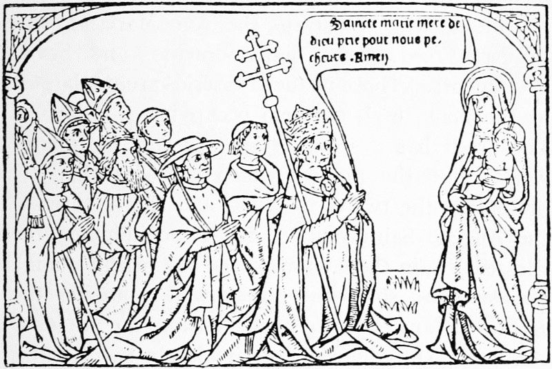 [21] e.g., in an edition printed by Jean Poitevin, May 15, 1498, the illustrations for Terce, Sext, Nones, Vespers, and Compline are from Vérard; the others, including the printer's device, were imitated from Pigouchet.