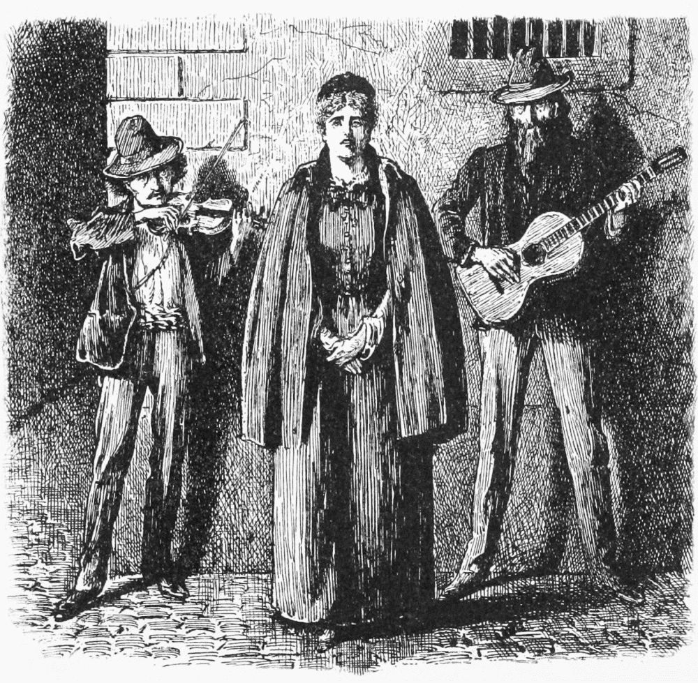"I have played the fiddle for her while she sang in the streets, at fairs and festas and Kermessen ... and seen the people go mad to hear her ... and once, at Prague, Svengali fell down in a fit from sheer excitement! and then, suddenly, our Trilby woke up and wondered what it was all about ... and we took him home and put him to bed and left him with Marta—and Trilby and I went together arm in arm all over the town to fetch a doctor and buy things for supper—and that was the happiest hour in all my life!