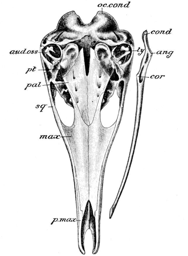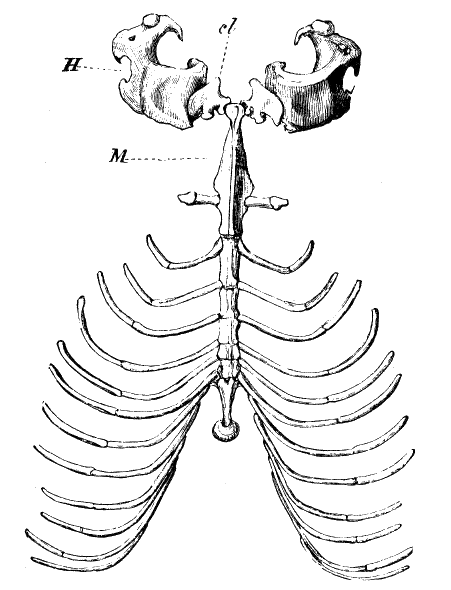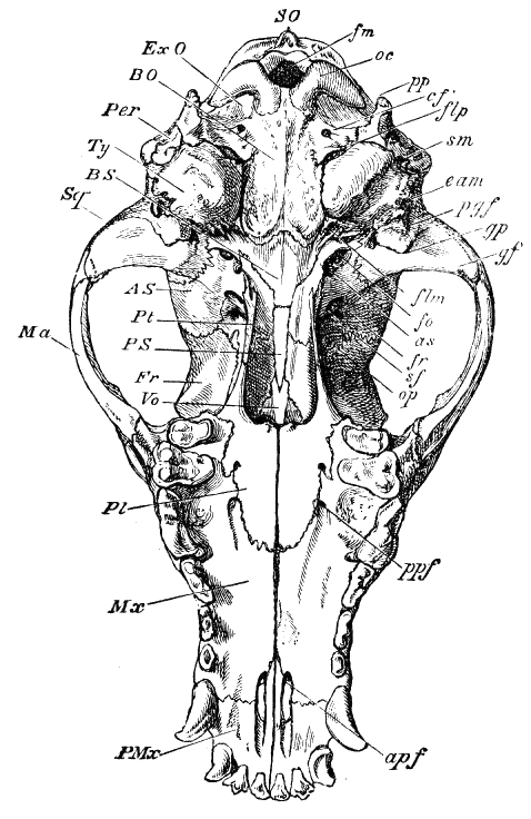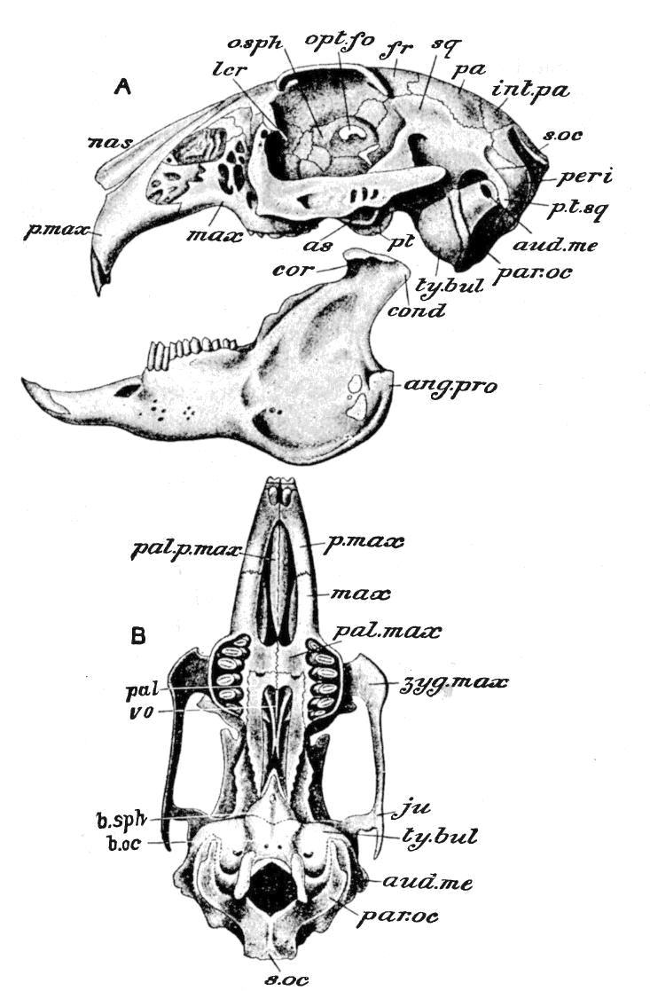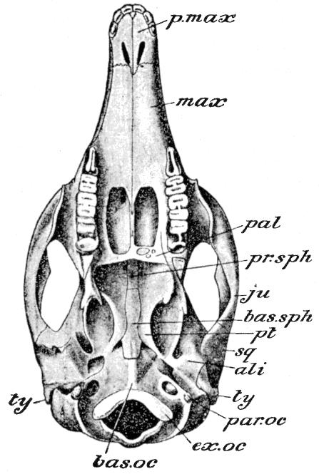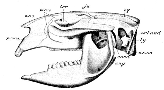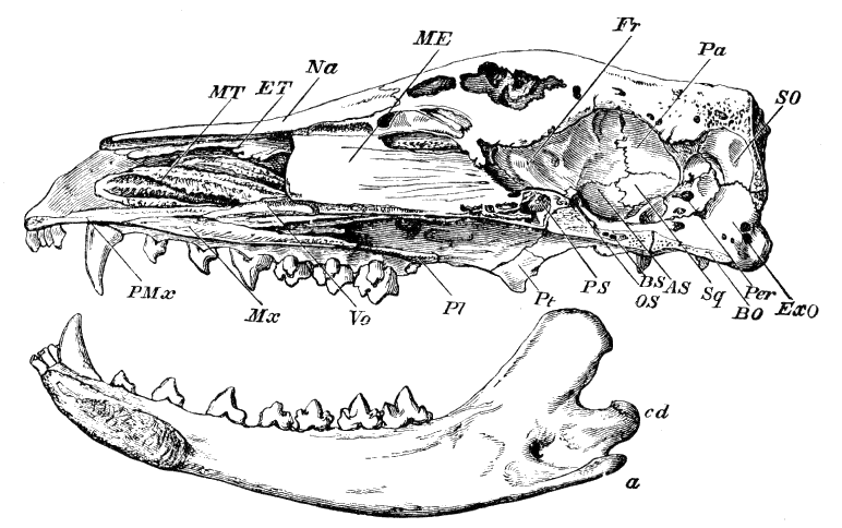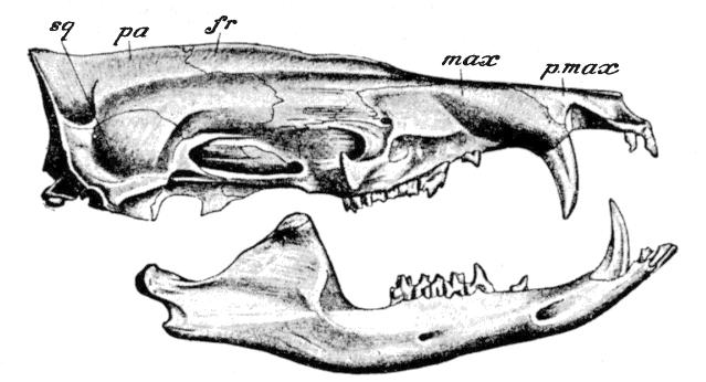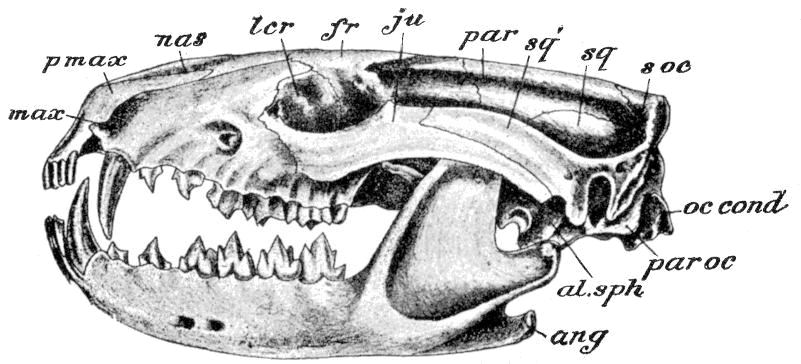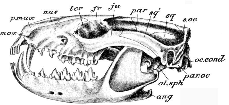 [366] Even in the Otter-like Potamogale the upper jaw, though broad and flat, projects considerably beyond the lower.