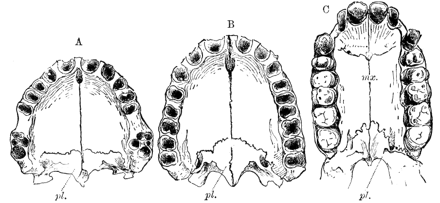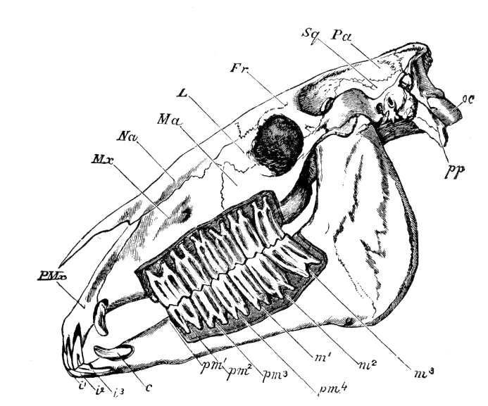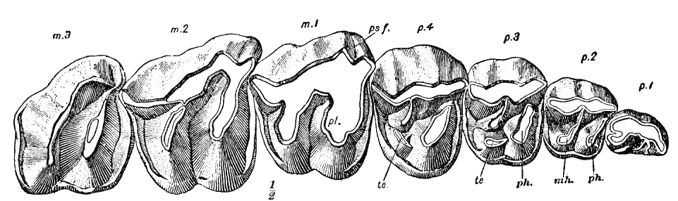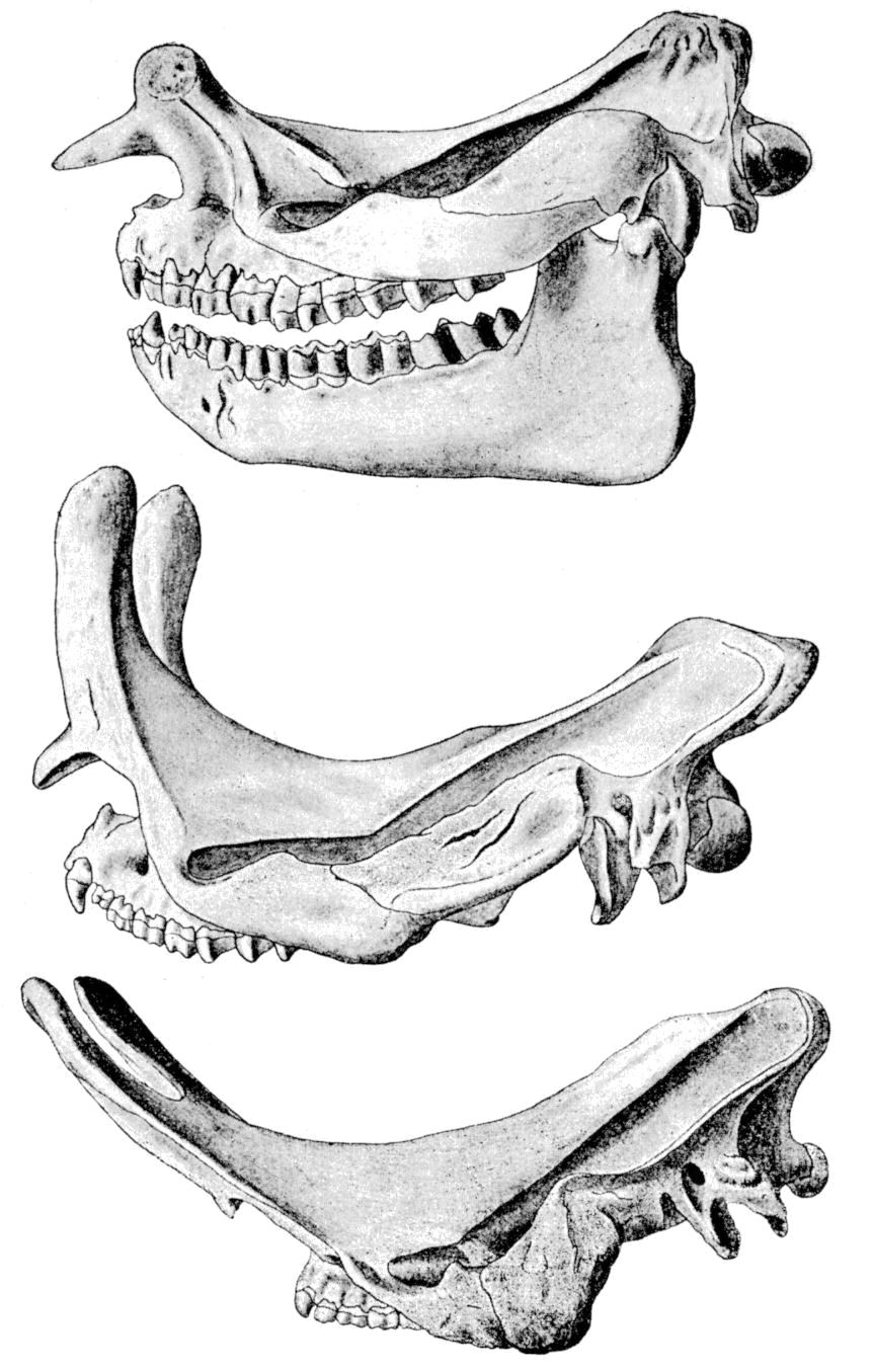 [373] I quote Woodward, Proc. Zool. Soc. 1896, for this dentition. The fourth molar of the lower jaw is not always present. It comes late, and only old animals possess it.