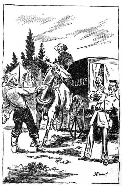 Enmeshed in surreptitious cordage, the speechless, untamed quadruped is thrown to the cold, cold ground, where, for a time, he writhes and struggles, a cheveaux-de-frise of black, gyrating hoofs. If he gets loose, he darts through an ambulance or climbs a tree without compunction. But he seldom gets loose. When his first wild anger has been measurably spent and the mercury in him has gone down to the bulb, five or six bow-legged hirelings of the quartermaster's bureau, with waffle-iron cast of countenance born of small-pox, simultaneously proceed to administer disjointed sections of harness to the exterior of that noble form.