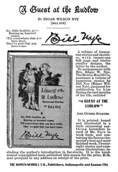 One morning James Whitcomb Riley dug up from the pile of recent books Bill Nye's post-humorous work, "A Guest at the Ludlow and Other Stories." It was not the first time he had seen it. Indeed; he has given more care and attention to the bringing out of this last work of his dead friend than he usually does to the mechanical and business details of his own books, and he had read and reread everything in it before it was given to the public. Yet he spent nearly an hour in loving examination of the volume, reading again with thorough enjoyment a number of the sketches.
