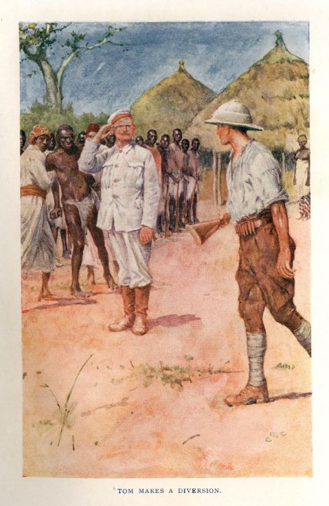 He sent Mirambo out with a dozen sharpshooters to feel his way down the nullah. Stealing along under cover of the bushes, the men had gone nearly two hundred yards before the sound of shots reached the trench. A scout hurried back to report that the whole of the enemy force was retreating. Tom instantly collected all his remaining fighting men, and led them down after Mirambo's party.