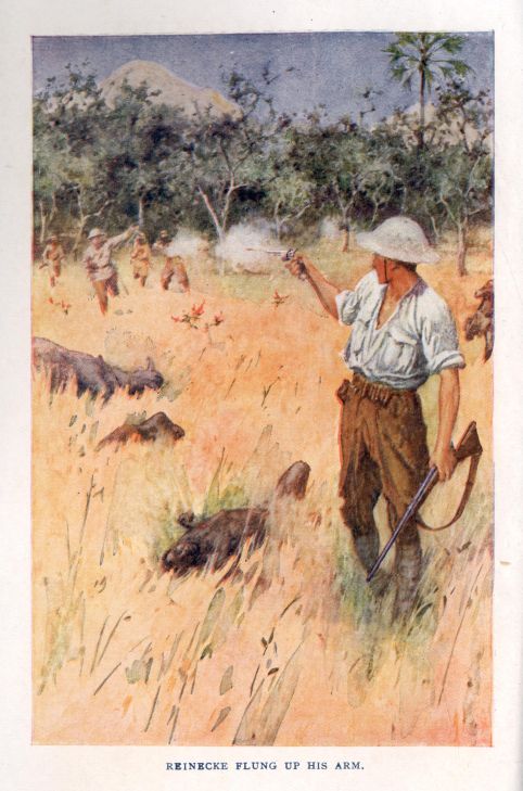 "Yes, he's dead--horribly. He came to attack me, and I collared him and put him on the island in the lake. I suppose he grew impatient when he heard the firing, couldn't wait for the end, and got his fellow-prisoners to make a sort of a raft. Our sentry deserted his post, with the most praiseworthy intentions, and Reinecke took advantage of his absence to launch the raft. He was attacked by crocodiles; Reinecke lunged at one, and toppled over. I saw the whole thing: the recollection makes me sick."