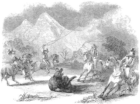 In about half an hour we made a point of rocks where the trail was bare. Our captain gave the order to dismount, and proceeded a short distance ahead to reconnoitre. The whole space occupied by our twelve horses and riders was not over six or eight feet wide by about thirty in length. Should any of the animals become stampeded, they were bound to go over. The tracks of several which had recently been pushed over the precipice by the pack trains were still visible. Our captain returned presently with news that a train was in sight. Soon we heard the tinkling of the bell attached to the leader, and then the clattering of the hoofs as the mules descended with their heavy burdens. One by one they passed. Whisky, gin, and brandy again! Barrels, half barrels, and kegs! The vaqueros made the cliffs resound with their Carambas and Carajas, their Doña Marias and Santa Sofias! a language apparently well understood by the mules. This was a train of forty mules, all laden with liquors for the thirsty miners. The vaqueros reported another train within half a mile of twenty-five mules, and others on the Grade.