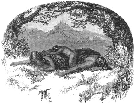 [1]"It has already been mentioned that in many parts of the island the soil was loose, and undermined by holes, and the rock weathered almost to rottenness. Pursuing a goat once in one of these dangerous places, the bushy brink of a precipice to which he had followed it crumbled beneath him, and he and the goat fell together from a great height. He lay stunned and senseless at the foot of the rock for a great while—not less than twenty hours, he thought, from the change of position in the sun, but the precise length of time he had no means of ascertaining. When he recovered his senses he found the goat lying dead beside him. With great pain and difficulty he made his way to his hut, which was nearly a mile distant from the spot; and for three days he lay on his bed enduring much suffering. No permanent injury, however, had been done him, and he was soon able to go abroad again.—[Life of Alexander Selkirk.]