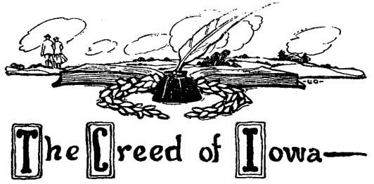 It must have become evident from this incomplete review that Iowa is literarily, to say the least, no longer inarticulate. It is equally apparent, to those who really know their Iowa, that, far from being a dead level of uninteresting prosperity, our state is rich in suggestive literary material, ready and waiting for the authors of the future. Topographically, Iowa abounds in surprises. In the midst of her empire of rich rolling prairie are lakes and rivers, rugged cliffs and wooded hills, villages and cities set upon hills overlooking beautiful valleys through which streams wind their way seaward, her east and west borders defended by castellated rocks overlooking our two great rivers. Ethnologically, within these borders are communities of blanket Indians still living in wigwams, surrounded by communities in which are practiced all the arts of an advanced civilization. Sociologically, side by side with her native-born and native-bred citizens, are communities of Christian Socialists, also remnants of a French experiment in Communism, Quakers, Mennonites, anti-polygamous Mormons, and whole regions in which emigrants from Holland, Germany and Scandinavia are slowly and surely acquiring American habits of thought and life. Historically speaking, we have the early and late pioneer period with its rapid adjustment to new conditions, with its multiform perils developing latent heroism, its opportunities for character-building and for public service. Later the heroic period, during which a peace-loving people quit the plow, the workshop, the country store, the office and even the pulpit, to rally to the defence of the Union. Then, the reconstruction and the new-construction period, in which Iowa prospered under the leadership of men—men who knew their duties as well as their rights, men who recognized, and insisted upon recognition of, that "sovereign law, the state's collected will." And now, an epoch of reviving patriotism coupled with a world-embracing passion for democracy, in which the youths and young men of the state are consecrating their strength, their talents and their lives to a great cause.
