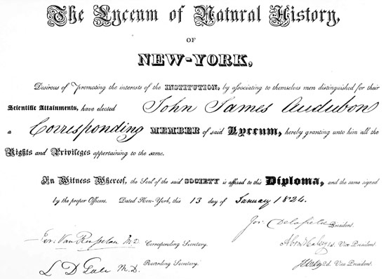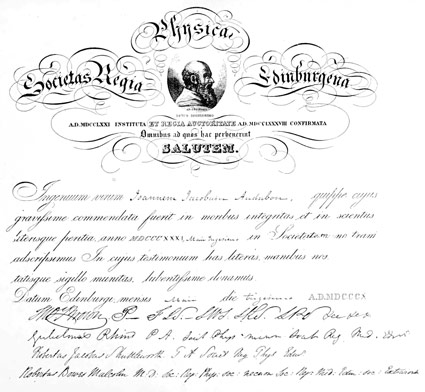 THE FACSIMILES OF THE DIPLOMAS WHICH FOLLOW ARE TAKEN FROM A FEW OF THE VERY MANY WHICH AUDUBON RECEIVED FROM THE SCIENTIFIC SOCIETIES OF EUROPE AND AMERICA. UNFORTUNATELY, AMONG THE MANY WHICH THE REPEATED FIRES HAVE DESTROYED WAS THAT OF THE ROYAL SOCIETY OF ENGLAND. THE LETTER ANNOUNCING TO AUDUBON HIS ELECTION TO THAT CELEBRATED SOCIETY, THE HIGHEST HONOR HE RECEIVED, IS THEREFORE SUBSTITUTED, WITH THE SIGNATURE OF SIR (FORMERLY CAPTAIN) EDWARD SABINE, THE ARCTIC EXPLORER.