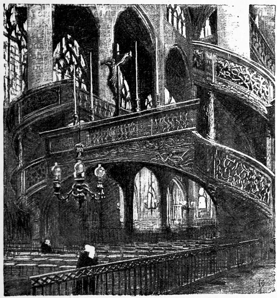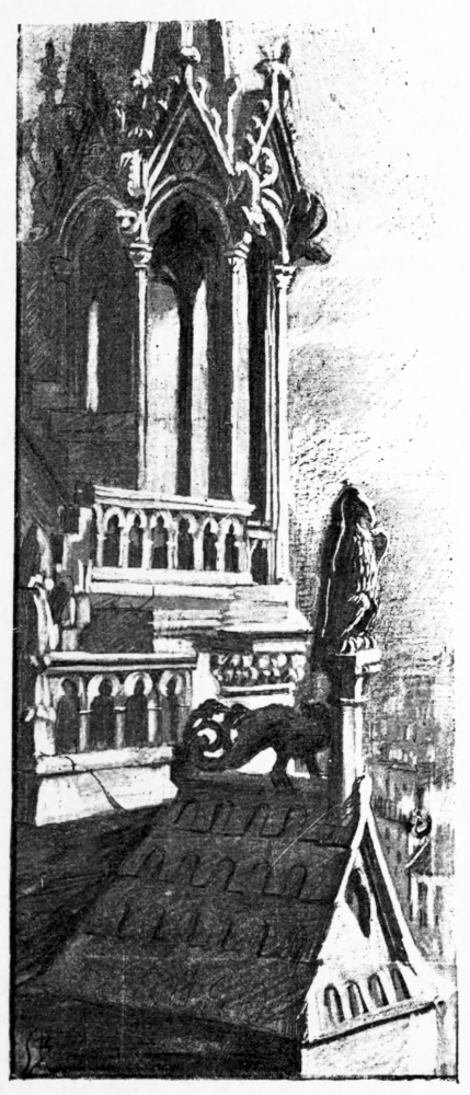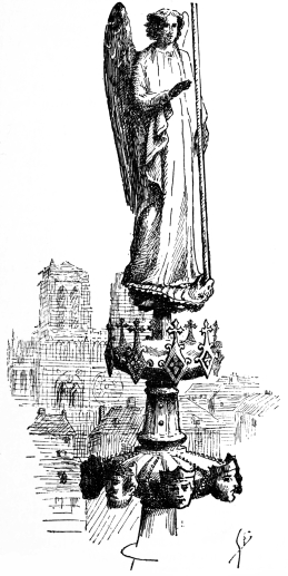 On the lower storey are colossal statues of the twelve Apostles, most of them portraits, the S. Thomas being that of the sculptor Lassus. The gables of the upper storey support Angels with the instruments of the Passion. The crockets of the spire are fleurs-de-lys, and the whole is resplendent with gilding. The summit of the chevet is surmounted by a huge Angel, in lead, holding a processional cross. There was an idea, never carried out, of making this statue turn round mechanically upon a pivot during the twenty-four hours, that it might present the symbol of salvation successively to all quarters of the city. The masks upon the pedestal of this figure are all portraits of the artists and workmen engaged upon the restoration of the chapel, posing as the Kings of France. The oratory, erected by Louis XI., between the two buttresses of the fourth bay, upon the south side, is decorated with niches and corbels of human heads.