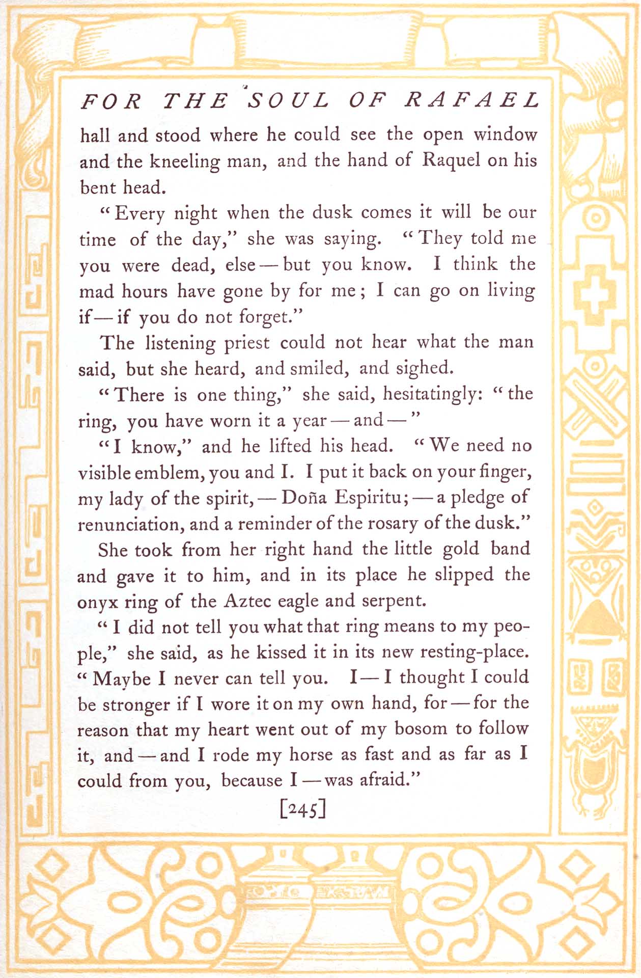 He caught her to him and held her there. The world reeled about them for one wordless minute, and then he released her and walked out across where the tower of the temple had once been, and he knew he was leaving her forever. A horse was waiting. He had said he could ride best in the moonlight, and a little later the hoof-beats sounded through the strumming guitars, and she knew it was over! It was her sacrifice for the oath to the dead, and she sank prostrate in the shadow of the altar. The tiny candles glimmered and went out, yet still she lay there. The moon in its soft yellow light flooded the open space without, but did not touch her. She had found the rosary and clasped it, her lips against the cold pearl figure of the sculptured Christ.