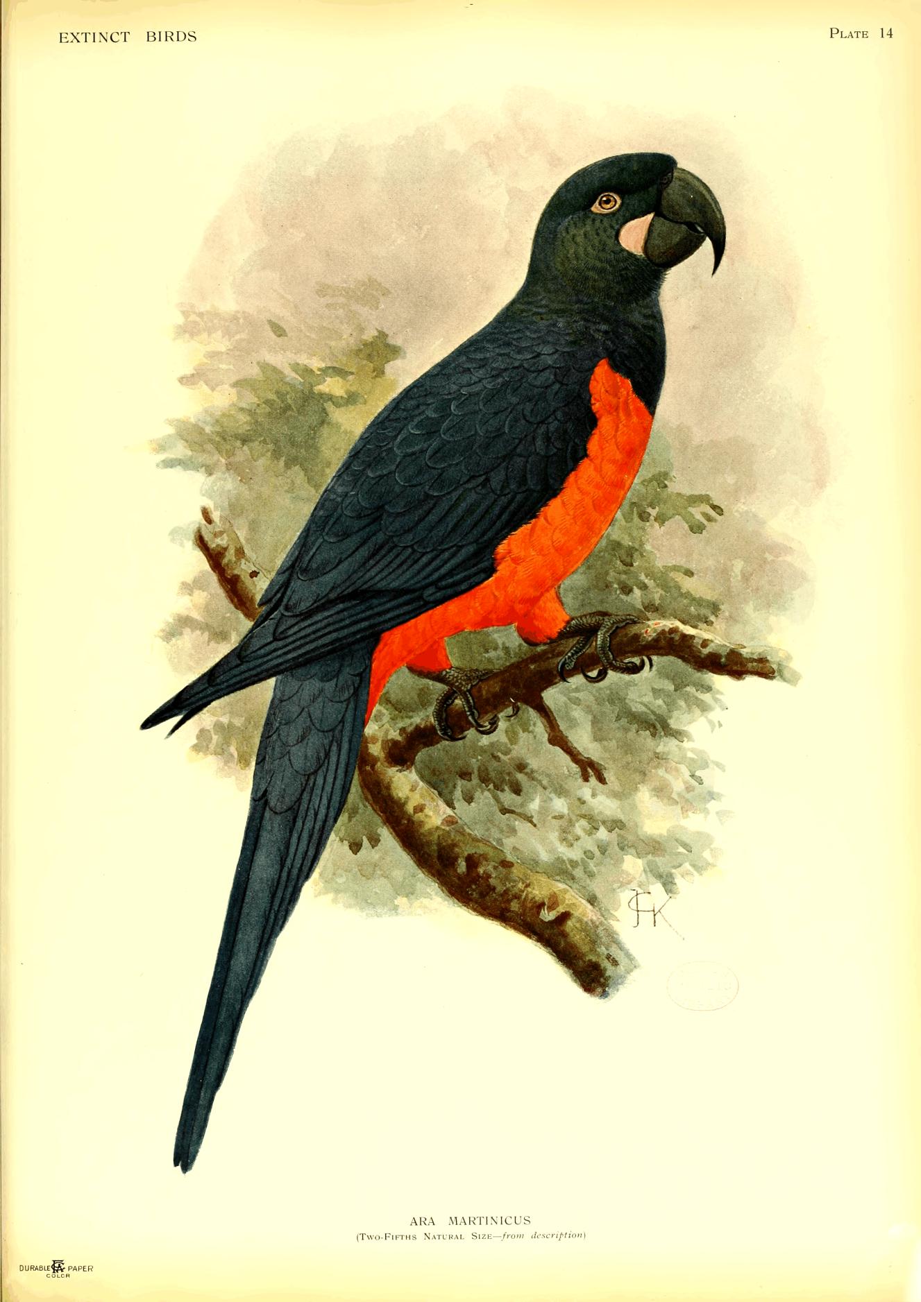 (In Vol. II, chapter VIII, the different species of Parrots are described, and it is stated that each island had three kinds, viz., an "Aras," a "Perroquet" and a "Perrique," evidently meaning a Macaw, an Amazona and a Conurus.)