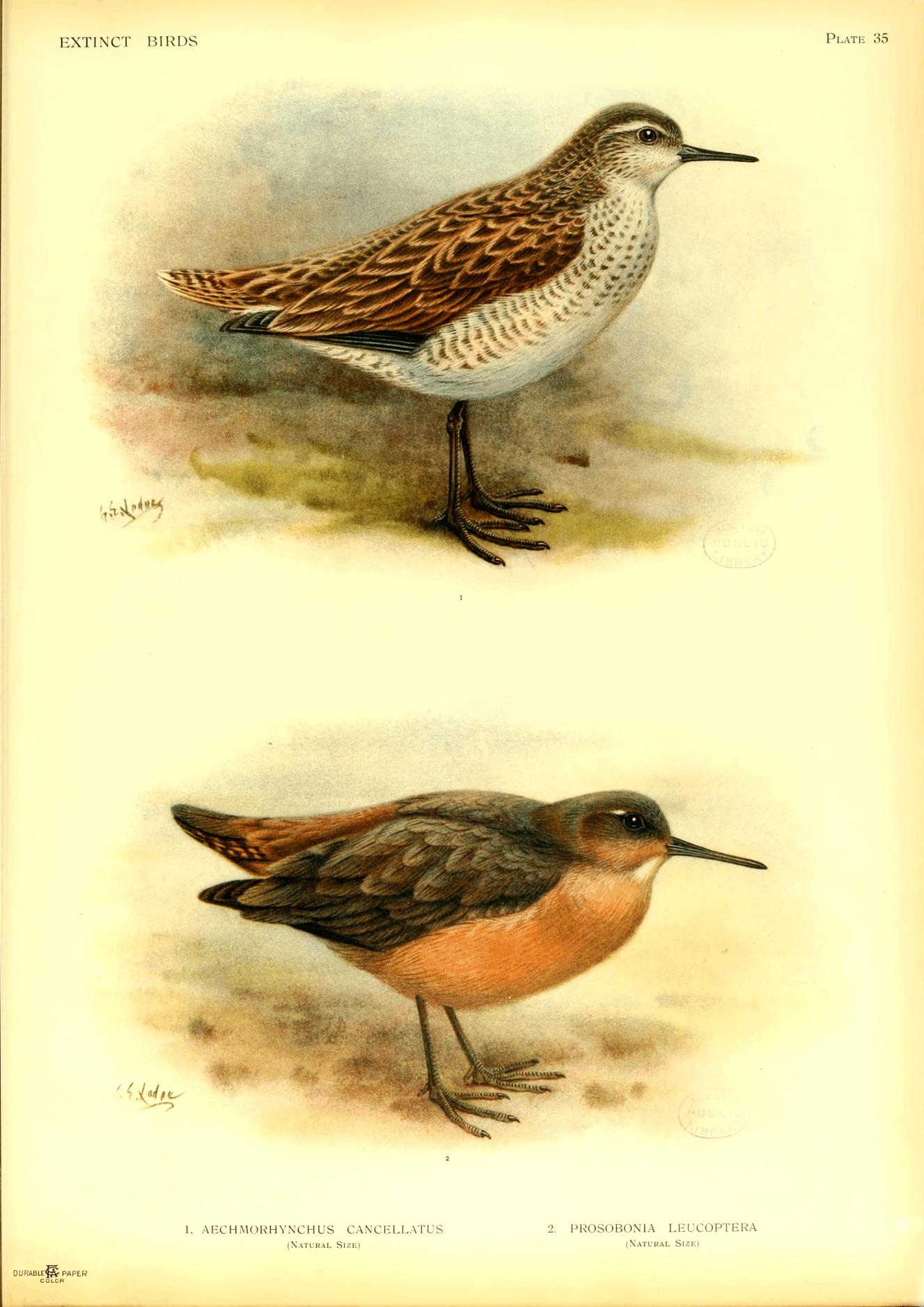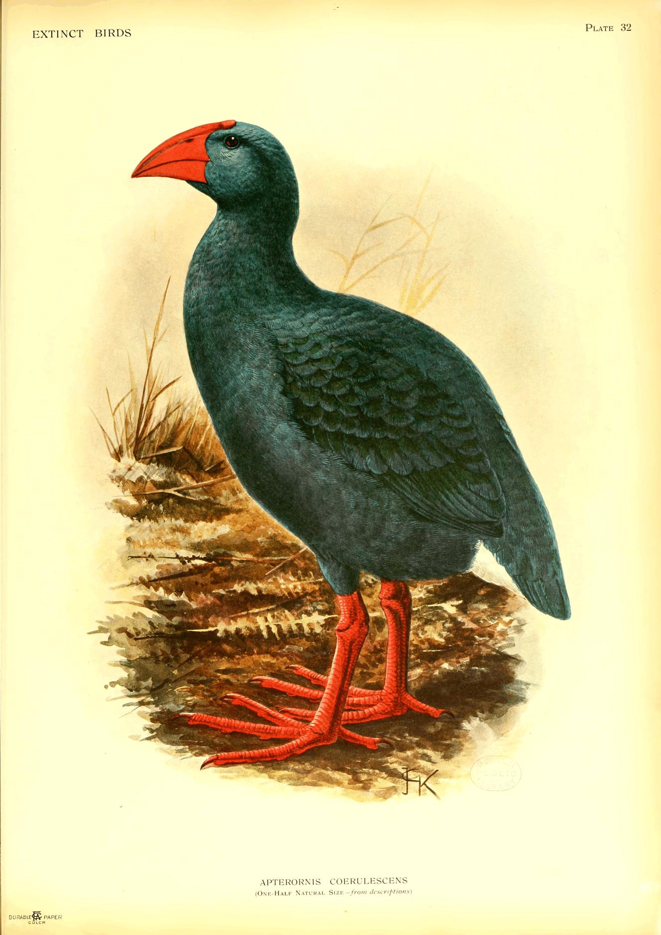 On the whole, this book is confined to species actually known to be extinct, but a few are included of which a small number is still known to exist, because firstly there seems no doubt that they will vanish soon, and secondly, as in the case of Notornis, it was necessary to clear up certain misconceptions and contradictory statements. In the case of a few species believed to be quite extinct, it is possible that some individuals may still exist in little known parts of their range, while on the other hand it is more than likely that several of the species referred to in my lecture (Proc. Orn. Congress pp. 191-207, 1907) as threatened with destruction, have already ceased to live. This may also be the case with some birds not alluded to at all.