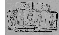 Nous voudrions de grand cœur donner ici le texte même de l'ouvrage, à ceux de nos charmants abonnés qui ne le connaissent point encore; malheureusement, ou n'a pas jusqu'ici découvert le moyen du faire tenir dix volumes in-8 dans un alinéa; cela viendra plus tard; en attendant, offrons aux impatients le portrait des principaux personnages qui figurent dans le roman de M. Eugène Sue. Le visage étant le miroir de l'âme, en voyant les héros, c'est comme si on lisait le livre; nous garantissons la ressemblance, jusqu'à la fin de la semaine prochaine. Le premier portrait, placé à gauche, vous représente le Maître d'école; un devine aisément à sa mine peu avenante, et ses doigts crochus, au manche de poignard qui s'allonge sur sa poitrine, que le drôle est un scélérat fieffé.--A côté de lui, voici la Goualeuse, ou plutôt Fleur de Marie, comme l'indiquent son attitude naïve et repentante, et ce bouquet de coquelicots et de bluets qui fleurit dans un pot, derrière elle.