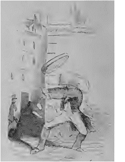 Le tambour-major se livre alors à toutes les grâces d'une délirante pantomime, à toutes les beautés d'attitudes triomphantes qui caractérisent ce magnifique guerrier, doué d'une si belle canne.