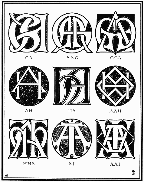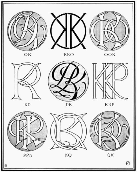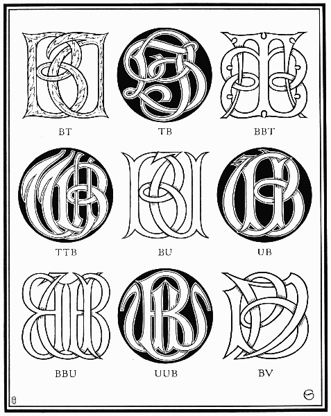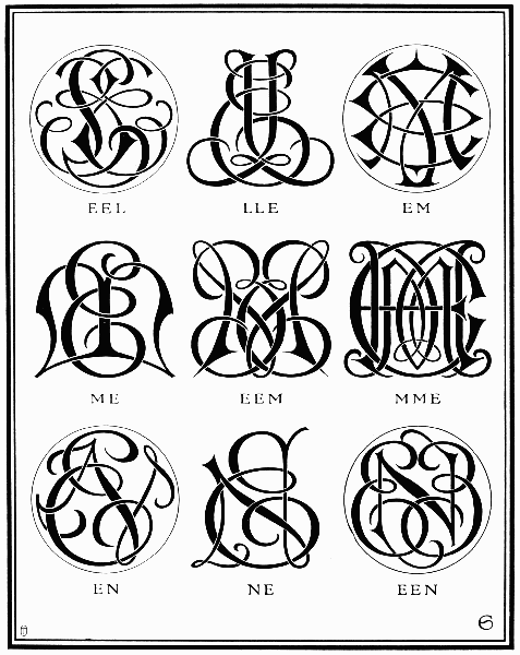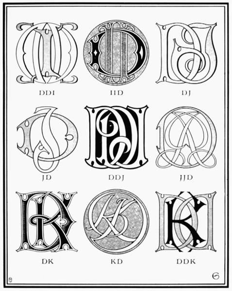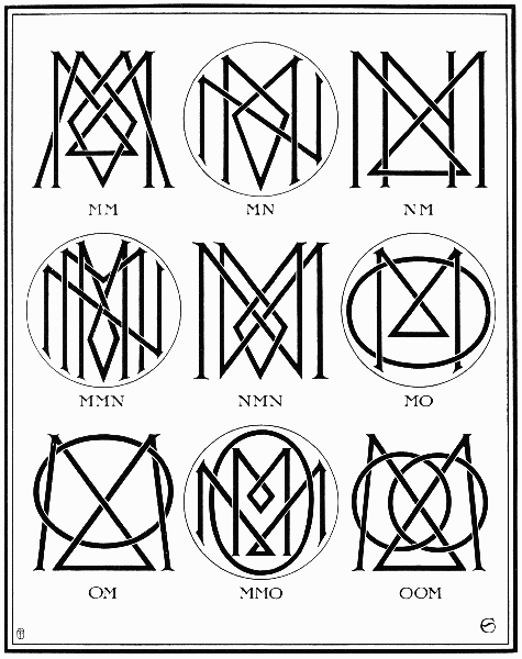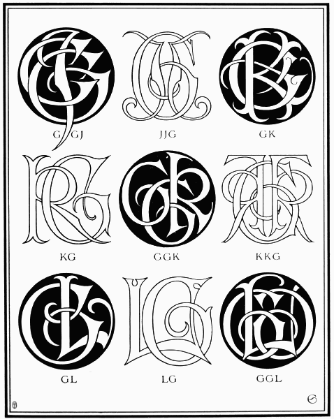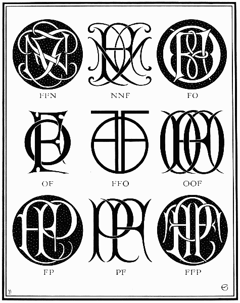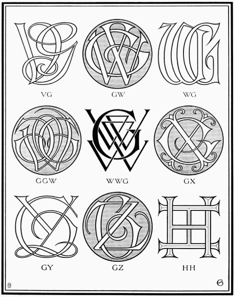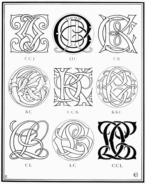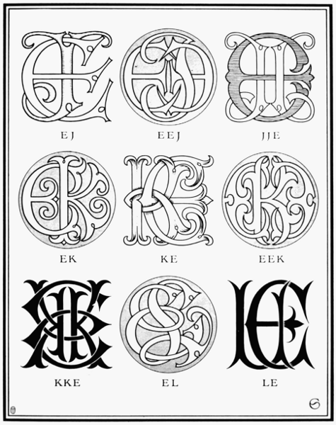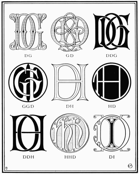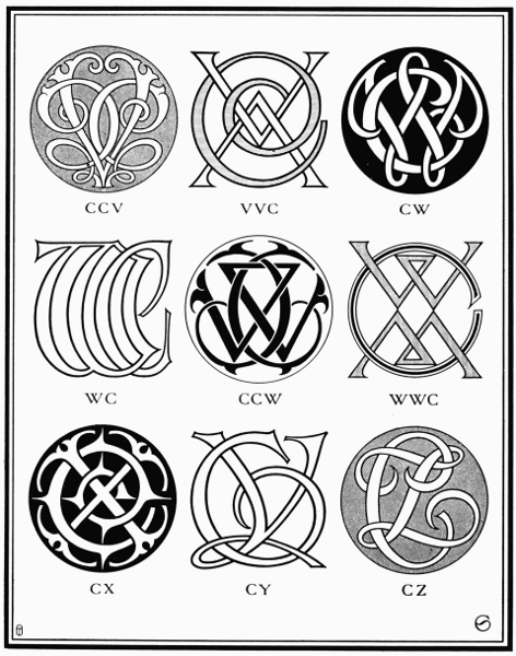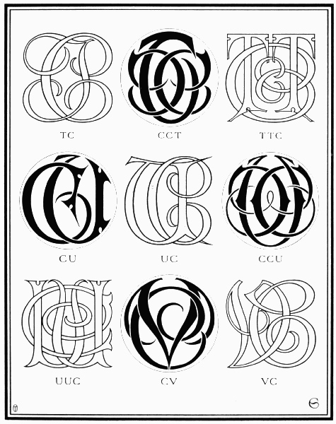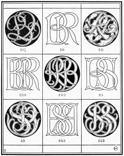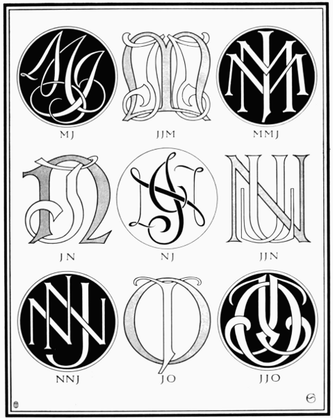A Monogram or Cipher is in all cases intended for ornament, whether used as a mark of ownership by private individuals, or for a company, or a trade-mark. For purposes of commerce it is of course important that the device should be distinct and easily read. The same might apply also to the design for a club or society mark. For private use, however, where the device is to enrich a piece of jewellery, plate, the binding of a book, a piece of furniture, or part of the decoration of a house, it should in the first place be a good design. If the conceit is legible to the owner, and is of such fine proportion as to be thoroughly satisfying to the eye, why should it read like an advertisement, or be like 'Everything in the shop marked in plain figures'?
