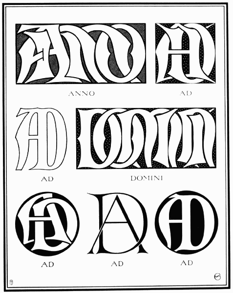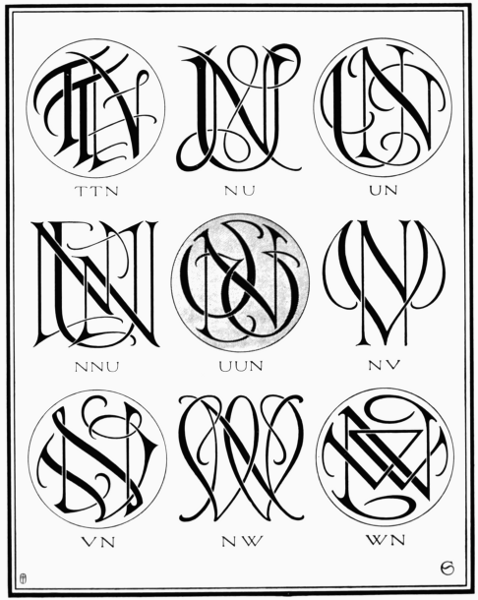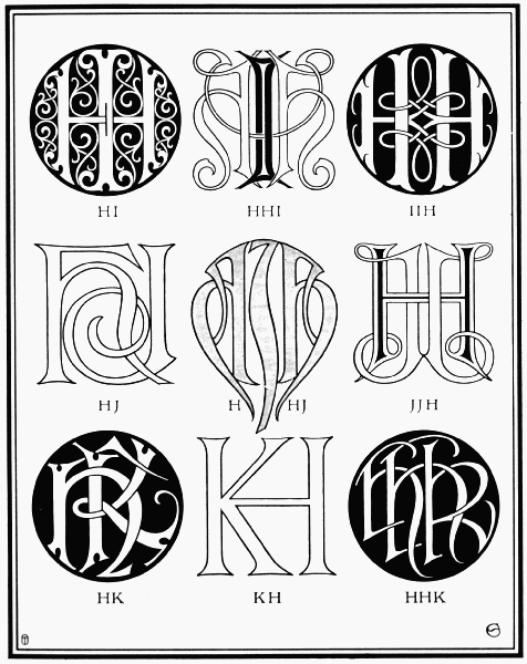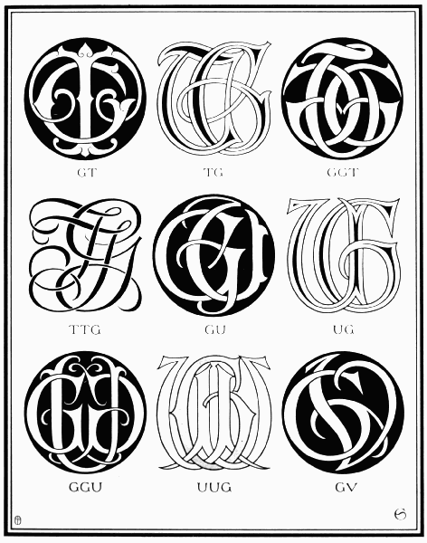 The styles included may be classed under five principal heads—Roman, Gothic, Sans Serif, Cursive or Running, and what I might call Rustic. These styles are treated in various ways, and in light and heavy letters. Here and there throughout the work a design will be found that may suggest a treatment for some particular device. These are odd pieces that have occurred to me as the plates were in progress, the execution of most of which would probably be more satisfactory in embroidery than any other medium. There are three principal forms of treating[Pg xiii] a device; I will call them the Imposed, Extended, and the Continuous forms. By the Imposed form I mean a design where the letters are written or interlaced directly over one another. In the Extended form the letters are interlaced or written side by side. In the Continuous form the device runs from beginning to end without a break. In the Imposed form the principal letter, whether it is first or final, should be accentuated, either by making it slightly larger, heavier, or in some other way best suited to the material in which it is being produced, it may be colour or texture. For the Extended form, if the letters are to be read in the order in which they follow one another, all may be treated alike. In this form, however, it is often advisable, for design and balance, especially when filling a circular space, to place the principal letter in the centre; in that case it may be drawn larger, and in some other way made more important. The Continuous form should read as the letters would be written, and care must betaken to place them so that they will not appear to read in some other way. It is intended that the Monograms and Ciphers shown in the following plates be considered as outlines only, as models or working drawings. The solid or tint grounds need not be taken as part of the design; they are intended to show which are planned in a round, and which in a square panel. There are but a few cases in which any detail is given that would apply to a particular craft, or suggest the material in which they are to be worked. Each artist or craftsman can use the forms, supplying his own[Pg xiv] detail to suit the technique of the work in hand. By this means the book should be equally useful to any craft. With this broad rendering it will be noticed that some of the designs do not appear to read in the order described; in such cases the important letter requires that detail which I have suggested in some instances with a tint or black. The order of description is followed throughout the book for the sake of easy reference; it is only departed from in a few places where one reading only is intended, as in the LRR on Plate LXXXIV, the continuous Monogram NMN on Plate LXXXVII, and the continuous Cipher WTW on Plate CX.