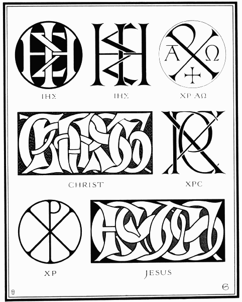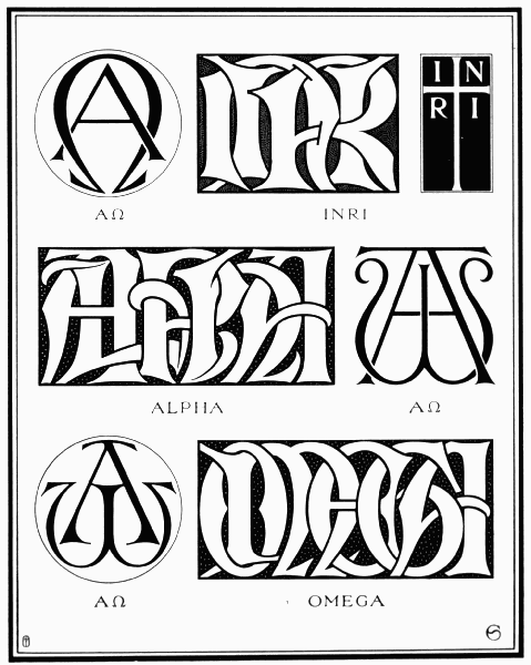 Monograms and Ciphers of three different letters will be found on Plates CXIV, CXV, and CXVI. On Plates CXVII to CXXI are firm-marks of two letters joined with the Ampersand, &. Plates CXXII to CXXVII show an alphabet with the '& Co.,' examples being given in round and square form. The last one of these plates contains also five examples of Numerals in Cipher, 1905, 1906, 1907, 1908, and 1909. Sacred Devices and Names fill Plates CXXVIII to CXXXII. Plates CXXXIII and CXXXIV are made up of Labels and three-letter Monograms. The letters for the Monograms are taken at random from a list of authors. The last plate, CXXXV, is a suggestion for the decorative treatment of Sacred Inscriptions in Monogram and Cipher, following the style of the Italian Renaissance.