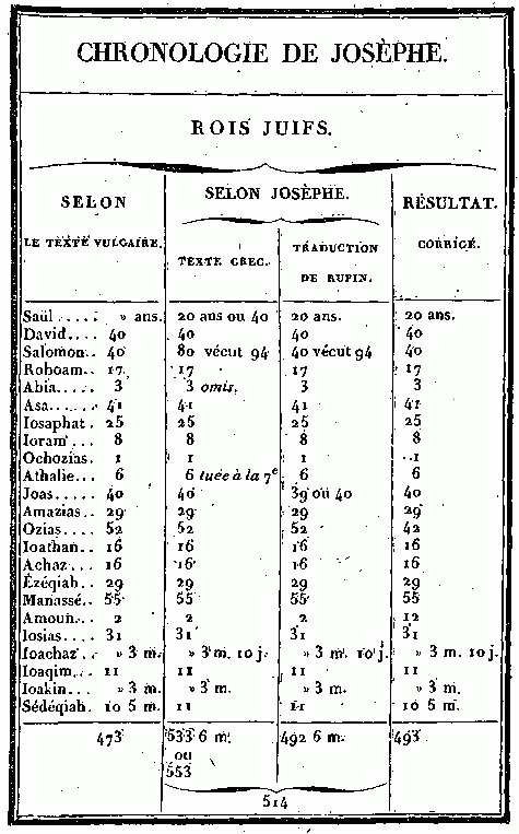 Nous avons vu que dans un autre passage Josèphe donne aux rois[10] de Jérusalem 514 ans de durée, y compris les 20 de Saül: voilà une contradiction palpable avec les 533 de sa liste grecque, et un excès de 20 ans sur les 493 de sa liste latine. N'est-il pas à croire qu'ici il a compté Salomon pour les 40 ans qui lui appartiennent, mais que les copistes ont ajouté à Saül les 20 ans nécessaires à compléter les 40 qu'ils ont voulu établir? Alors cette altération serait antérieure à Rufin même, et l'on voit quels embarras des copistes infidèles jettent dans les textes des écrivains. Eh! comment cette audace n'aurait-elle pas existé dans des temps de barbarie, et dans le secret des copies écrites à la main, quand de nos jours Havercamp a osé introduire dans son édition imprimée, une altération choquante, un faux matériel, en écrivant 522 dans sa traduction latine, au lieu de 532 que porte le grec imprimé à coté[11]!