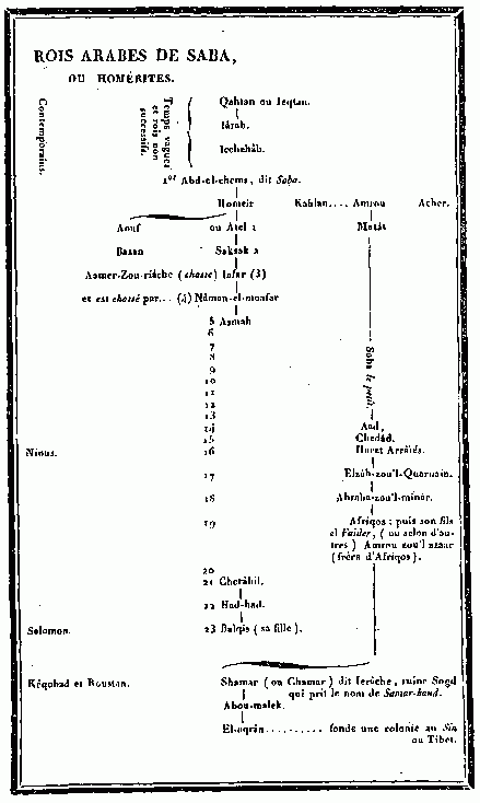 [321] Le latin observe la même analogie de mots et d'idées car vincere (vaincre) n'est qu'une modification de vincire, lier, vinctus, victus, vinctor, victor. L'historien Hamza déclare que l'étymologie de Saba l'embarrasse; mais, elle est exacte dans l'hébreu, ou sabah (shabah) signifie emmener captif. Ainsi l'antique homérite était analogue à l'hébreu, et nous en verrons un autre exemple dans les noms de Zohák.