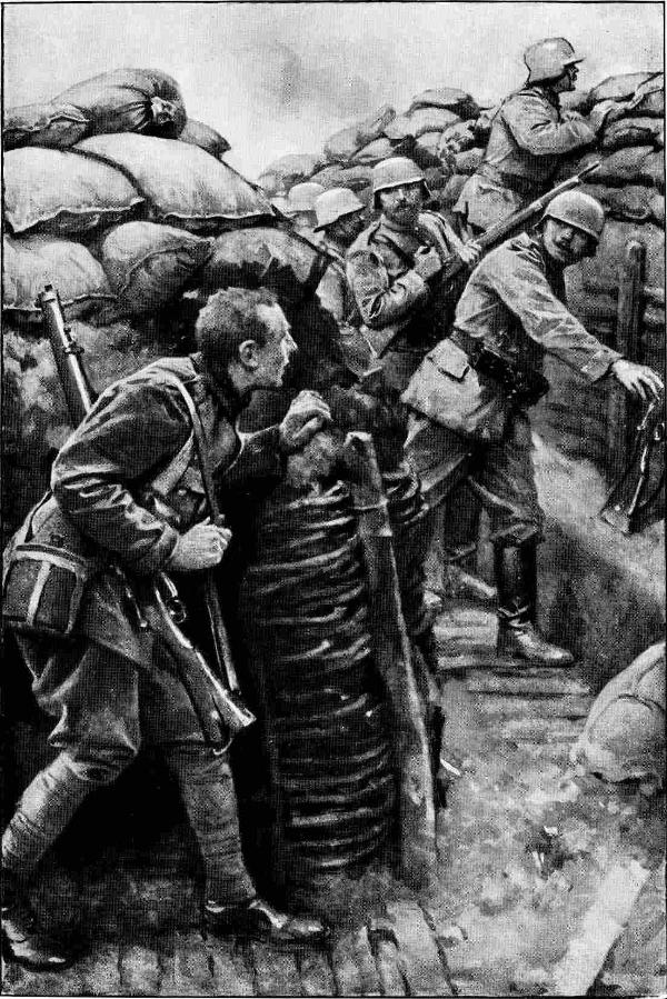 Into the machine-gun slits bombs were tossed in dozens, until the confined space within the redoubt was filled with noxious smoke from the loud-sounding missiles of destruction. Still the Huns held out. When one machine-gun was disabled another was brought up; but by this time the deadly weapon had lost much of the sting.
