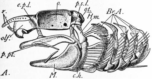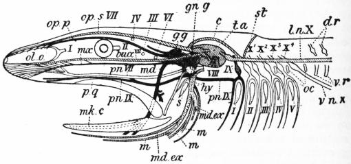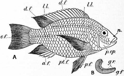 The commencement of the history of ichthyology coincides with that of zoology generally. Aristotle (384-322 B.C.) had a perfect knowledge of the general structure of fishes, which he clearly discriminates both from the aquatic animals with lungs and mammae, i.e. Cetaceans, and from the various groups of aquatic invertebrates. According to him: “the special characteristics of the true fishes consist in the branchiae and fins, the majority having four fins, but those of an elongate form, as the eels, having two only. Some, as the Muraena, lack the fins altogether. The rays swim with their whole body, which is spread out. The branchiae are sometimes furnished with an operculum, sometimes they are without one, as in the cartilaginous fishes.... No fish has hairs or feathers; most are covered with scales, but some have only a rough or a smooth skin. The tongue is hard, often toothed, and sometimes so much adherent that it seems to be wanting. The eyes have no lids, nor are any ears or nostrils visible, for what takes the place of nostrils is a blind cavity; nevertheless they have the senses of tasting, smelling and hearing. All have blood. All scaly fishes are oviparous, but the cartilaginous fishes (with the exception of the sea-devil, which Aristotle places along with them) are viviparous. All have a heart, liver and gall-bladder; but kidneys and urinary bladder are absent. They vary much in the structure of their intestines: for, whilst the mullet has a fleshy stomach like a bird, others have no stomachic dilatation. Pyloric caeca are close to the stomach, and vary in number; there are even some, like the majority of the cartilaginous fishes, which have none whatever. Two bodies are situated along the spine, which have the function of testicles; they open towards the vent, and are much enlarged in the spawning season. The scales become harder with age. Not being provided with lungs, fishes have no voice, but several can emit grunting sounds. They sleep like other animals. In most cases the females exceed the males in size; and in the rays and sharks the male is distinguished by an appendage on each side of the vent.”