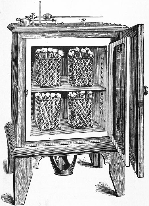 Another form of d’Arsonval incubator has a glass door in the side of it and a slightly modified form of the heat regulator.