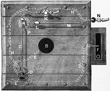 Hearson, however, has constructed a “cool biological incubator,” in which by an ingenious device the expansion or contraction of the thermostatic capsule deflects a horizontal pipe (C) (fig. 12), through which cold water from an ordinary tap is kept running, in one of two directions. If it is deflected so as to open into the tube (D), the cold water passes into the tank (F), where it is warmed by a gas flame, and thence it passes into the water-jacket of the incubator. If it is deflected so as to open into the pipe (E), it then runs through the ice tank (B), containing broken ice, before passing through the water-jacket of the incubator. If it poured into neither of these pipes it then simply passes out through the pipe (H) to the waste pipe (N). By this device the temperature of the incubator can be kept constant at any desired point, even though it may be some 30° to 40° C. below that of the external air.