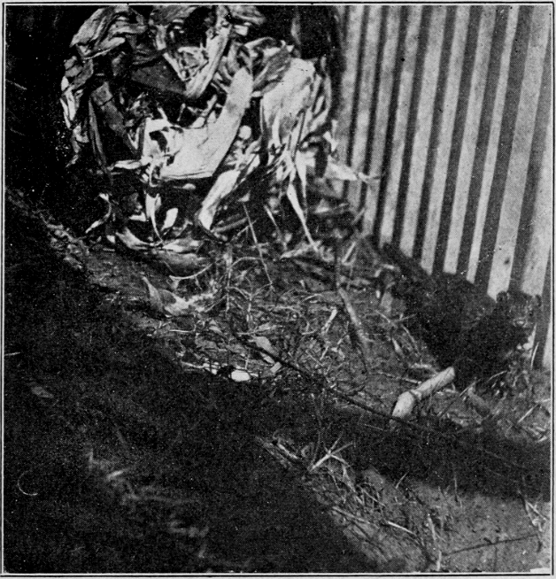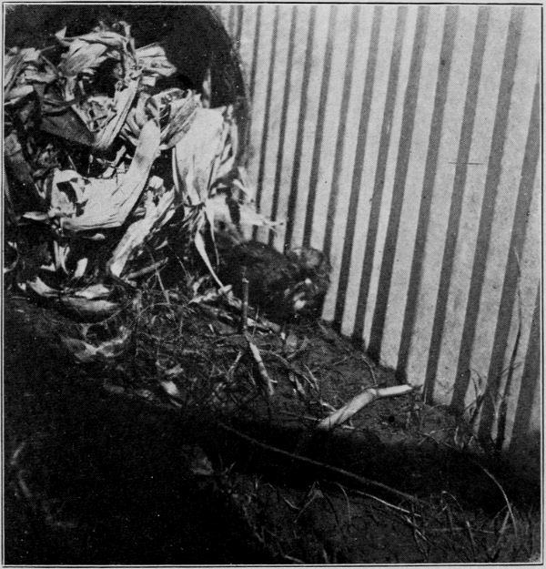 The following photograph shows a small pentagonal farm, the walls of which are made with sheets of corrugated, galvanized iron. Each side measures sixteen feet in length, extending four feet underground and four feet aboveground. Wire netting is used to cover the farm, not to prevent the minks from jumping over, although the walls are too low, but to prevent chickens, cats and buzzards from entering and eating the food put in for the minks. A wooden shed also covers a part of the small farm and serves to keep out some of the rain and heat, there being no shrubs or trees therein. There are two [Pg 37] small troughs in the ground for holding water, and in the center of the farm there is a place for the minks to live during the day, which consists of boards laid five inches above the surface of the ground with about fourteen inches of dirt on top. Under these boards it is dark during the day and always damp and cool. There are also several barrels in this farm filled with corn shucks and hay for the minks to enter during cold weather. The minks in this little farm are fed with the spleen of cattle, different meats, crayfish and other small fishes. The cost of this farm, or pen, which has been used for experimental purposes only, amounts to approximately forty-two dollars. It is large enough to raise two hundred minks if they are properly fed and cared for.