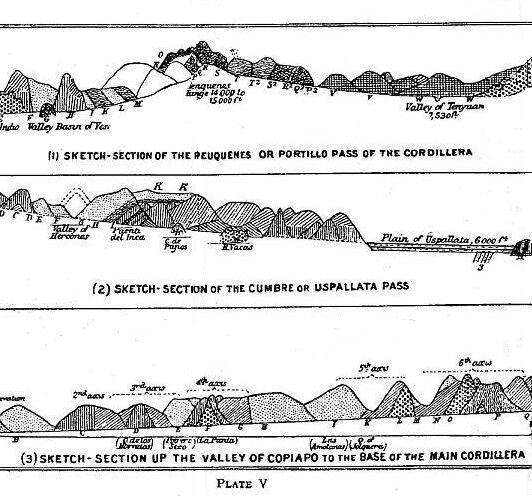Central Chile.—Basal formations of the Cordillera.—Origin of the porphyritic clay-stone conglomerate.—Andesite.—Volcanic rocks.—Section of the Cordillera by the Peuquenes or Portillo Pass.—Great gypseous formation.—Peuquenes line; thickness of strata, fossils of.—Portillo line.—Conglomerate, orthitic granite, mica-schist, volcanic rocks of.—Concluding remarks on the denudation and elevation of the Portillo line.—Section by the Cumbre, or Uspallata Pass.—Porphyries.—Gypseous strata.—Section near the Puente del Inca; fossils of.—Great subsidence.—Intrusive porphyries.—Plain of Uspallata.—Section of the Uspallata chain.—Structure and nature of the strata.—Silicified vertical trees.—Great subsidence.—Granitic rocks of axis.—Concluding remarks on the Uspallata range; origin subsequent to that of the main Cordillera; two periods of subsidence; comparison with the Portillo chain.