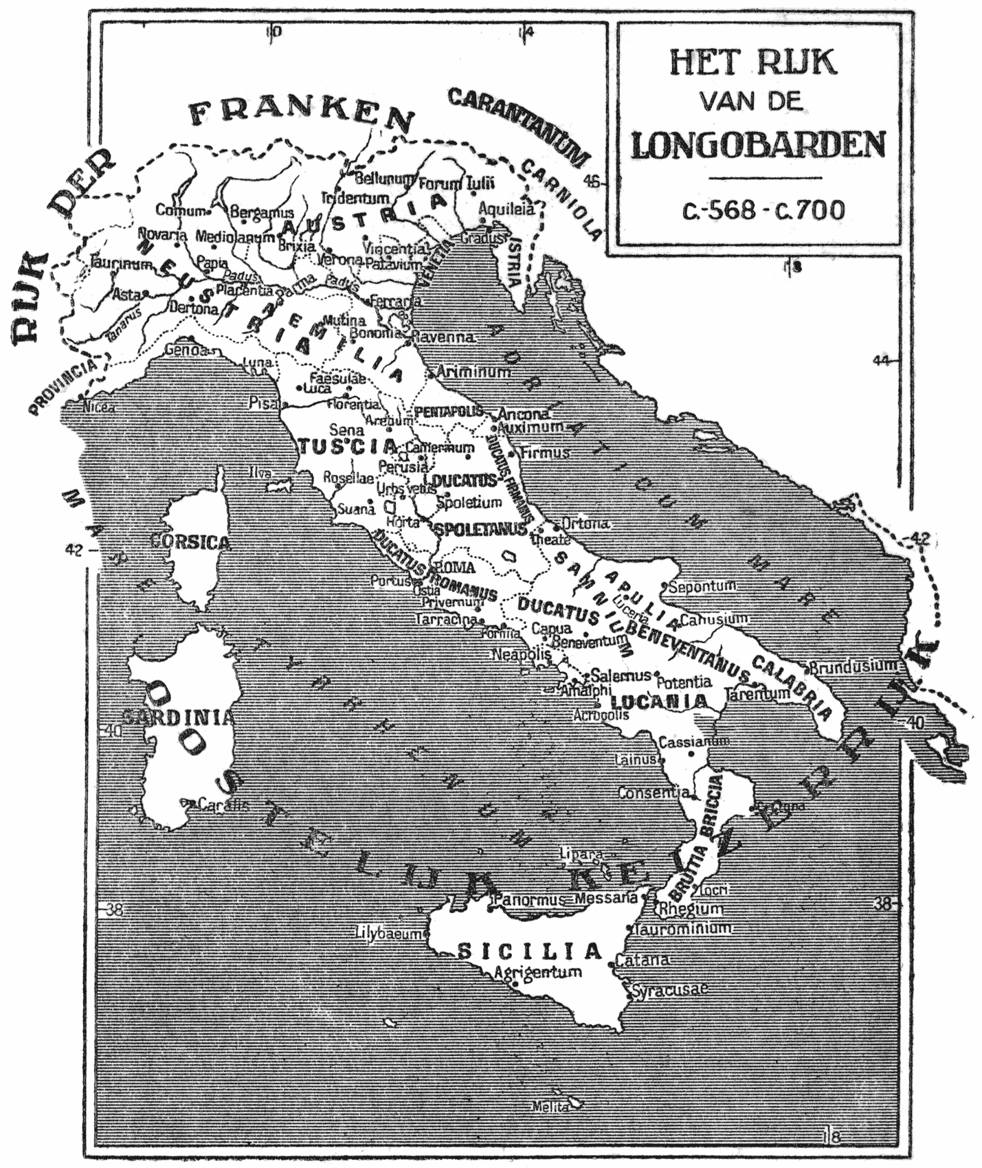 Evenwel, daar ons onderwerp Italië en niet Byzantium is, zal het beter zijn aan te nemen, dat het werkelijke Romeinsche Keizerrijk eindigde met de onttroning van den laatsten opvolger van Augustus te Rome in 476 en na dat jaar onze aandacht voornamelijk tot Italië te bepalen, terwijl wij slechts nu en dan een blik naar de andere zijde van de Adriatische Zee zullen werpen.