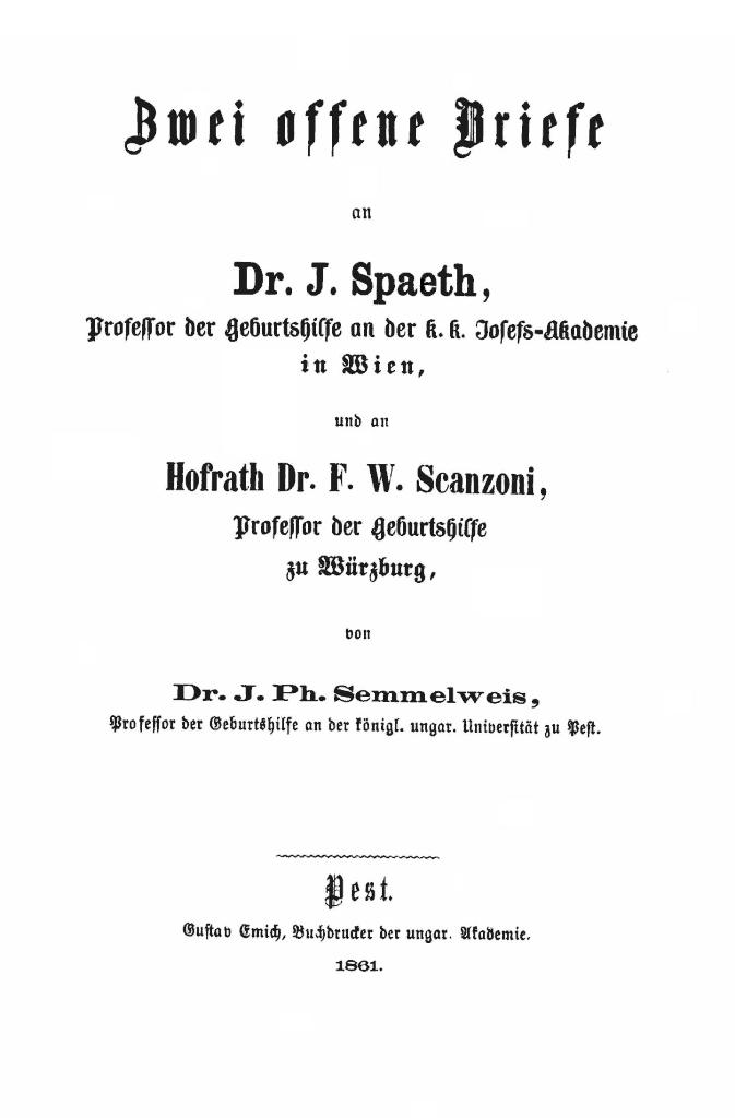 [1] Die Aetiologie, der Begriff und die Prophylaxis des Kindbettfiebers von Prof. Semmelweis. Pest, Wien und Leipzig 1861.