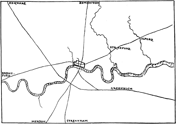 | Fig. 17.—London and the Roman Roads: The Watling Street through Greenwich and Edgware; the Erming Street through Merton and Edmonton, called also the Stone Street south of London; the Here Street through Brentford and Stratford | 53 |