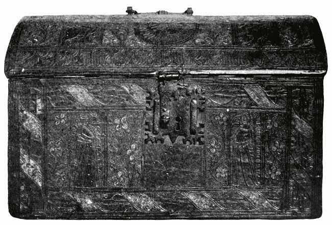 Leather coffers, when well executed, constitute veritable works of art. They present considerable difficulties in78 the mounting of the leather over the wooden coffer so that the lines of the ornament come exactly in the right place. It is necessary that the lines forming the framework of the design should accurately correspond with the dimensions of the coffer to be covered. A coffer usually consists of a box with a hinged lid; the measure is taken by laying the leather round the whole; the leather is then cut, leaving a small surplus at the edges to be pared and folded over at the sides. The join should be arranged for at the lower border and not at the intersection of the lid and the box. The leather at this point is better left to be cut after it has been stuck on the wood in mounting.