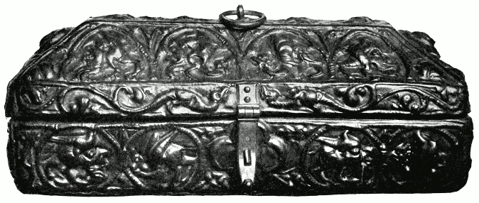 Meanwhile, punches, cut in relief or in intaglio and used with a hammer, were adopted to break the monotony of the groundwork and throw up the relief of the ornament, and the fashion also arose of embossing leather with a modelling tool or by means of stamps, the latter method necessarily resulting in the substitution of repeating ornament for figures and landscapes.