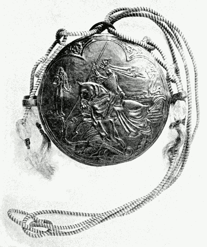 First in order of time we find skins covered with hair, sewn together for carpets or hangings; different kinds being placed side by side, either irregularly, or alternately to form a pattern. We are not, however, here concerned with anything but leather proper, that is to say, skins with the hair removed, and this was first decorated by means of a hot tool. The addition of colour speedily followed. Dark coloured leathers were also sewn as borders on lighter ones, and polished metal ornaments were added to brighten the leather groundwork, a fashion borrowed from the method of joining and strengthening the accoutrements of war.