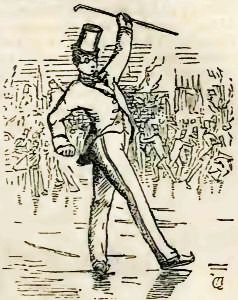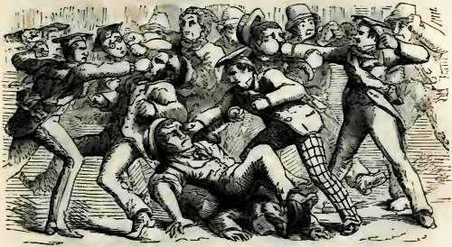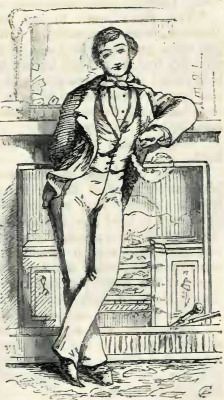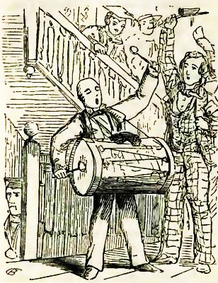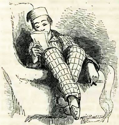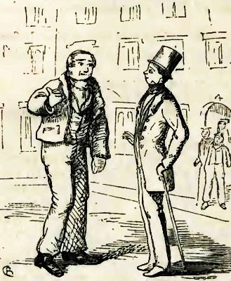 "I'll bet you a bottle of blacking, Giglamps," said little Mr. Bouncer, as he directed our hero's attention to the stranger, "that this respected party is an intending Freshman. Look at his customary suits of solemn black, as Othello, or Hamlet, or some other swell, says in Shakspeare. And, besides his black go-to-meeting bags, please to observe," continued the little gentleman, in the tone of a wax-work showman; "please to hobserve the pecooliarity hof the hair-chain, likewise the straps of the period. Look! he's coming this way. Giglamps, I vote we take a rise out of the youth. Hem! Good morning! Can we have the pleasure of assisting you in anything."