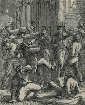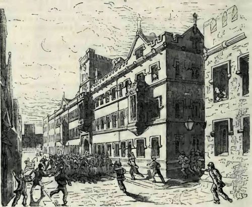 [2] Town and Gown disturbances are of considerable antiquity. Fuller and Matthew Paris give accounts of some which occurred as early as the year 1238. These disputes not unfrequently terminated fatally to some of the combatants. One of the most serious Town and Gown rows on record took place on the day of St. Scholastica the Virgin, February 10th, 1345, when several lives were lost on either side. The University was at that time in the Lincoln diocese; and Grostête, the Bishop, placed the townspeople under an interdict, from which they were not released till 1357, and then only on condition that the mayor and sixty of the chief burgesses should, on every anniversary of the day of St. Scholastica, attend St. Mary's Church and offer up mass for the souls of the slain scholars; and should also individually present an offering of one penny at the high altar. They, moreover, paid a yearly fine of 100 marks to the University, with the penalty of an additional fine of the same sum for every omission in attending at St. Mary's. This continued up to the time of the Reformation, when it gradually fell into abeyance. In the fifteenth year of Elizabeth, however, the University asserted their claim to all arrears. The matter being brought to trial, it was decided that the town should continue the annual fine and penance, though the arrears were forgiven. The fine was yearly paid on the 10th of February up to our own time: the mayor and chief burgesses attended at St. Mary's, and made the offering at the conclusion of the litany, which, on that occasion, was read from the altar. Thia was at length put an end to by Convocation in the year 1825.