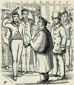 "Beg your pardon, sir," said Mr. Filcher, touching his forehead;[Pg 9] for, as Mr. Filcher, after the manner of his tribe, never was seen in a head-covering, he was unable to raise his hat or cap; "beg your pardon, sir! but was you a lookin' for the party as examines the young gents for their matrickylation?"
