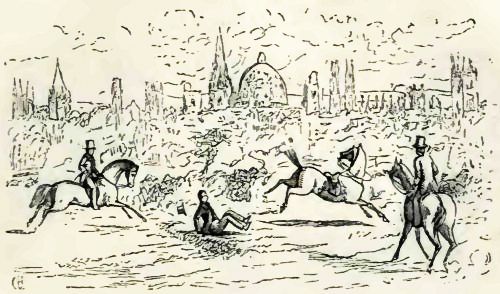 "He forgives you for the sake of your family, young man!" said Mr. Bouncer with pathos; "you've come to the right shop, for this is Brazenface; and you've come just at the right time,[Pg 4] for here is the gentleman who will assist Mr. Pluckem in examining you;" and Mr. Bouncer pointed to Mr. Four-in-hand Fosbrooke, who was coming up the street on his way from the Schools, where he was making a very laudable (but as it proved, futile) endeavour "to get through his smalls," or, in other words, to pass his Little-go examination. The hoax which had been suggested to the ingenious mind of Mr. Bouncer, was based upon the fact of Mr. Fosbrooke's being properly got-up for his sacrifice in a white tie, and a pair of very small bands—the two articles, which, with the usual academicals, form the costume demanded by Alma Mater of all her children when they take their places in her Schools. And, as Mr. Fosbrooke was far too politic a gentleman to irritate the Examiners by appearing in a "loud" or sporting costume, he had carried out the idea of clerical character suggested by the bands and choker, by a quiet, gentlemanly suit of black, which, he had fondly hoped, would have softened his Examiners' manners, and not permitted them to be brutal.