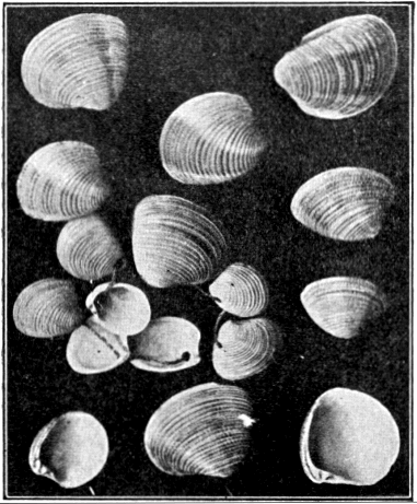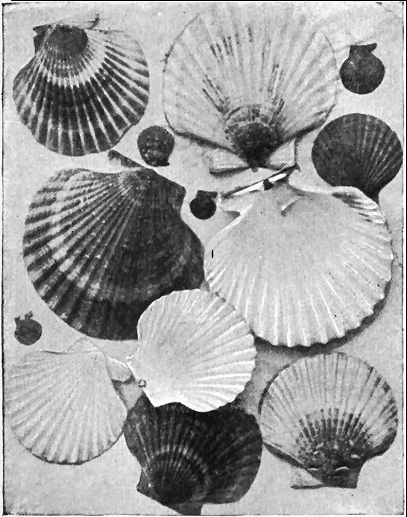 Fig. 1.—The Scallop Shell, Pecten Opercularis (see page 107), slightly reduced in size. The larger shells are from Douglas, Isle of Man; the smaller shells are young specimens from LLandudno, North Wales.